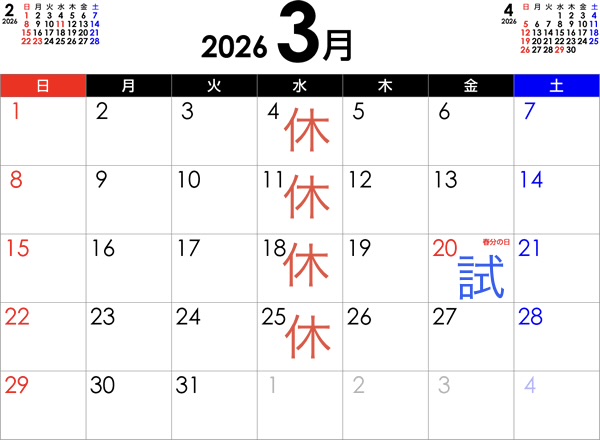 3月の定休日のお知らせです。